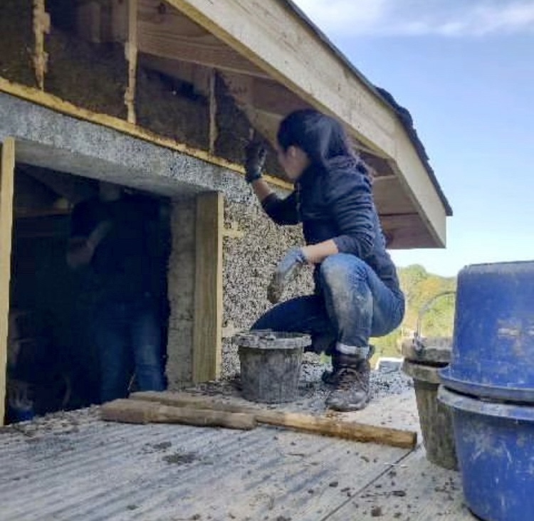 Mixing light straw-clayApplying daub to woven wattle made with foraged bamboo and vines