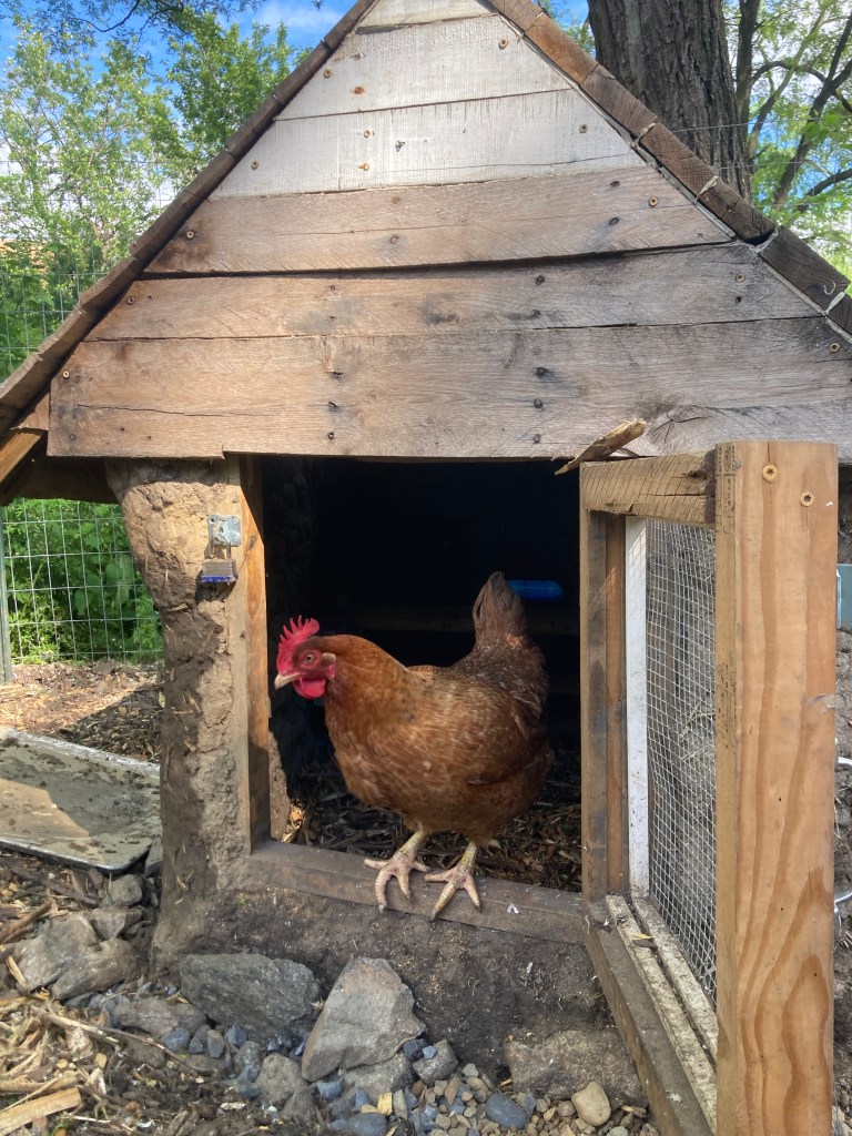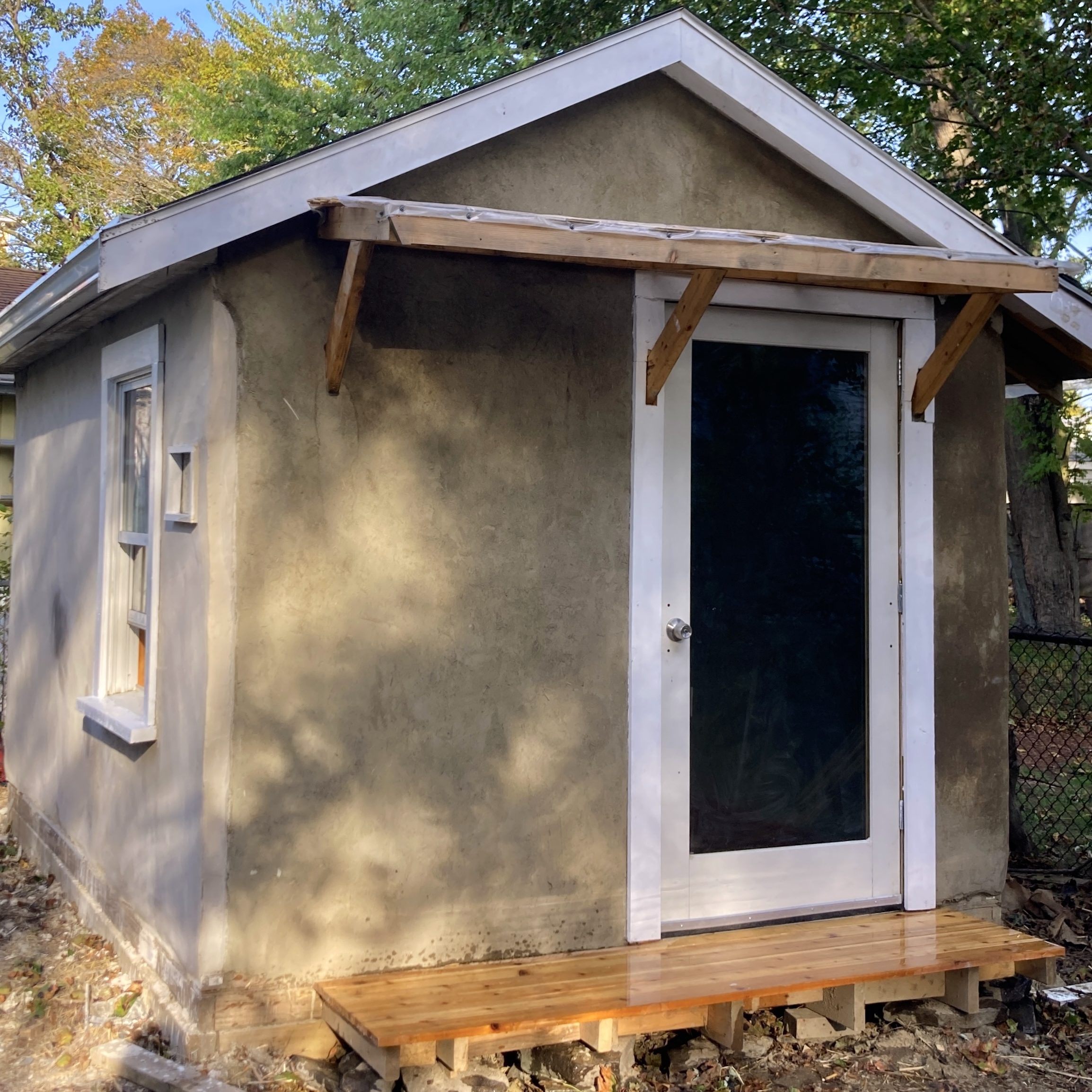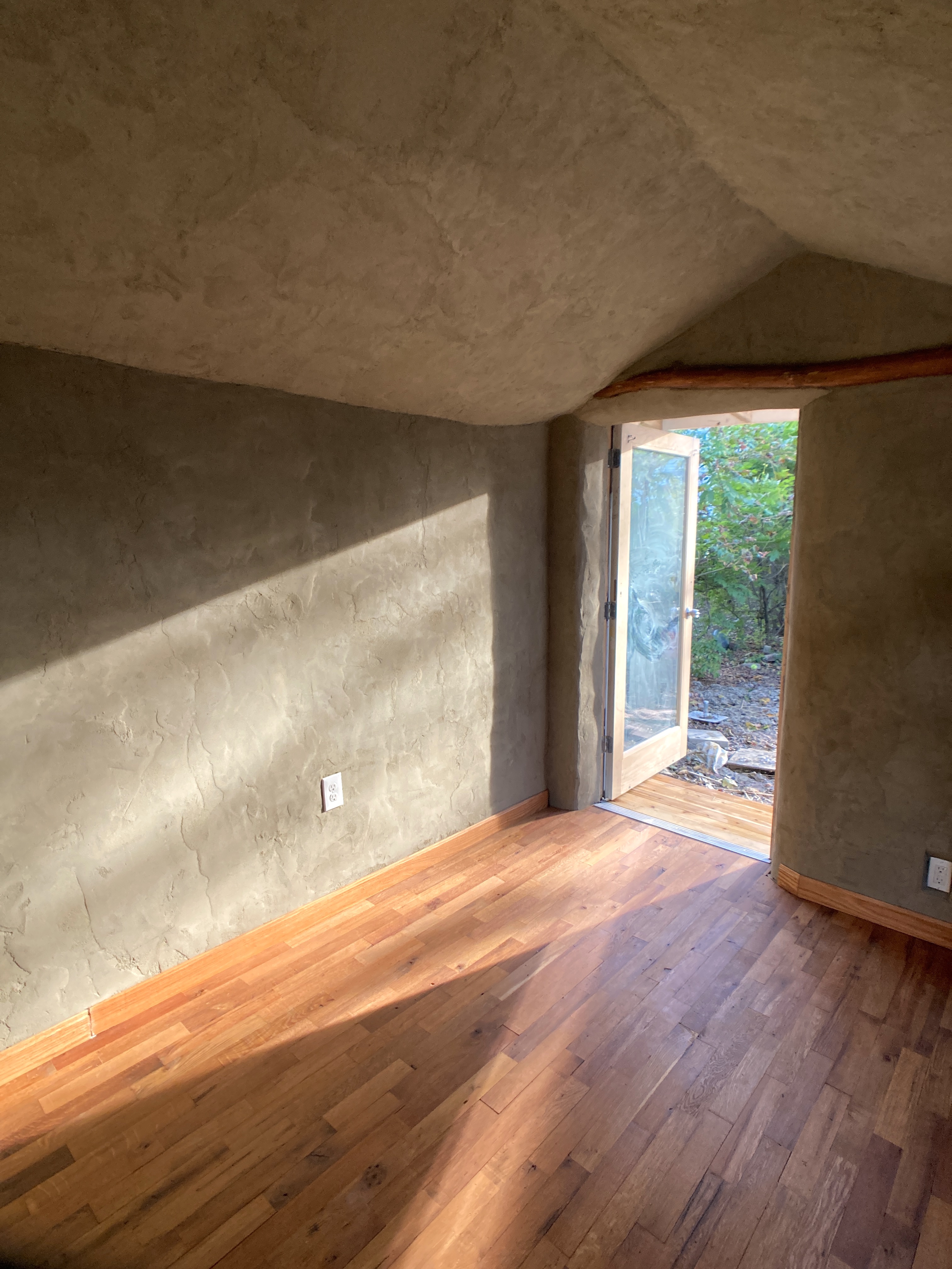 The tree behind naturally shades the structure from hot summer sun, leaving gorgeous dappled light on the front exterior clay plaster.