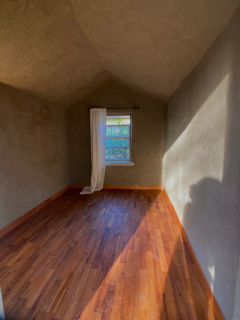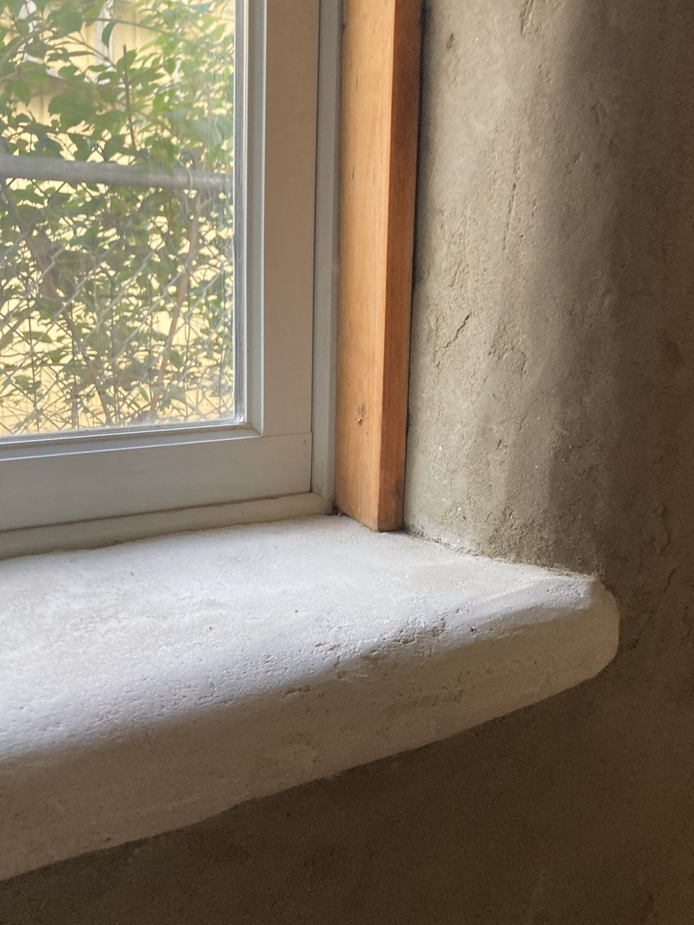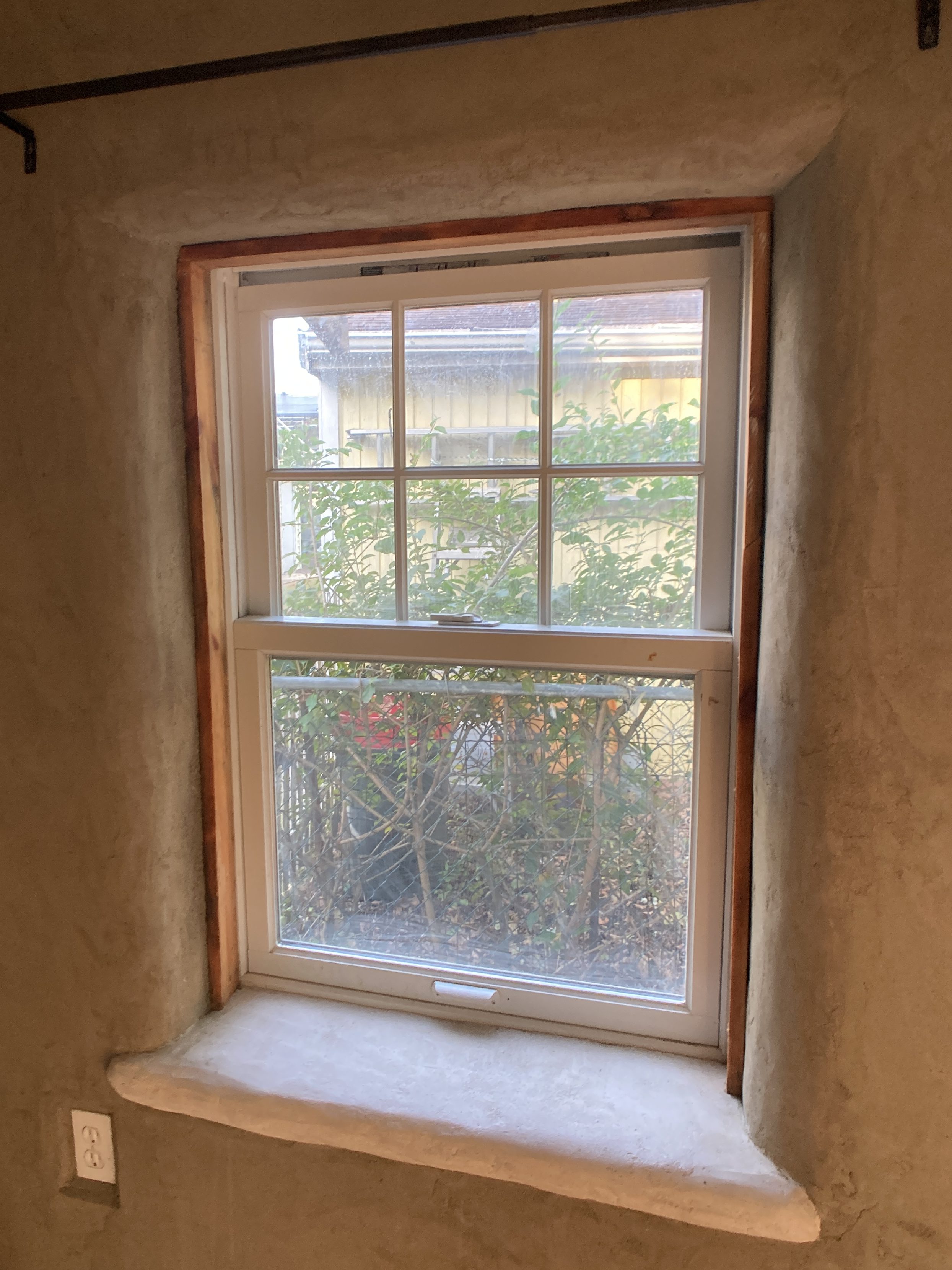 Reclaimed double-glazed window bounces light off of the curved clay plaster reveal.