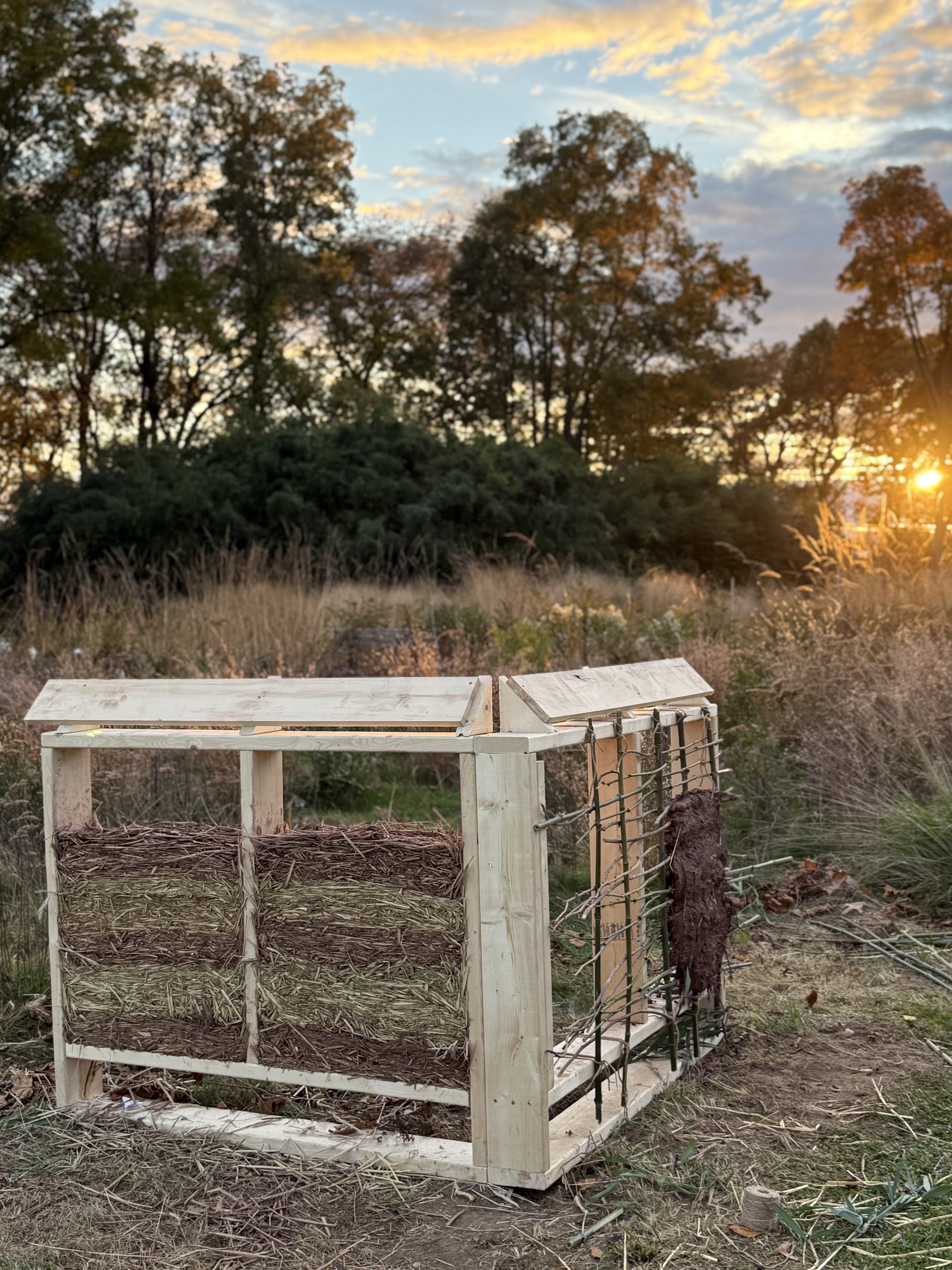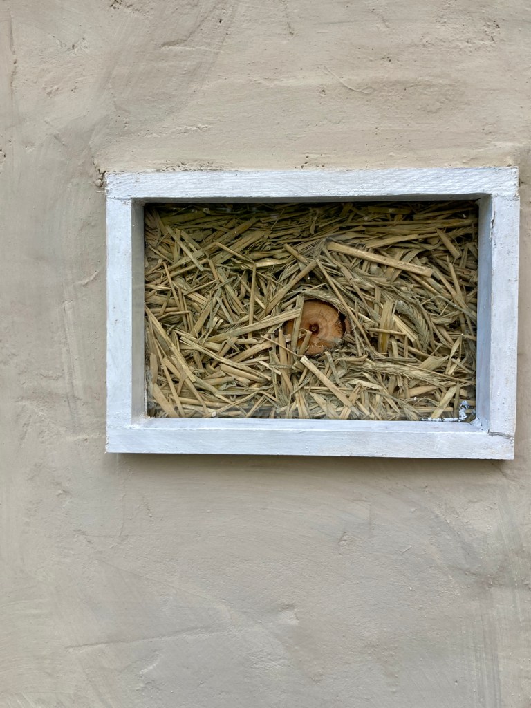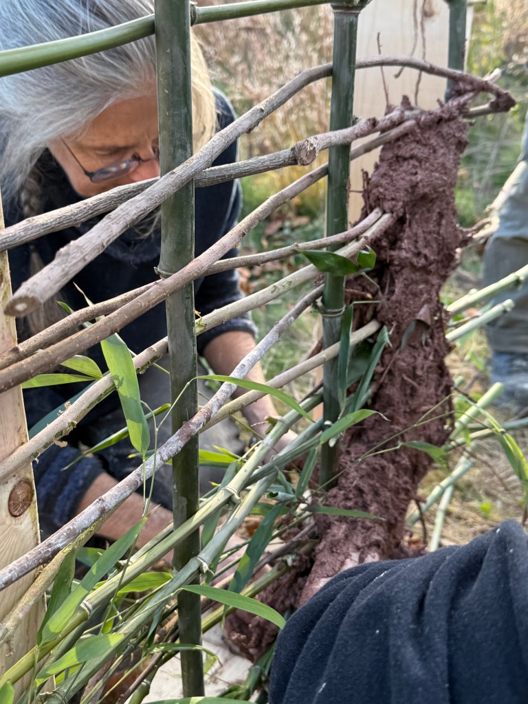 Free standing wall section with light straw-clay on one side and bamboo wattle-and-daub on the other. Cedar shingles on top not shown.
