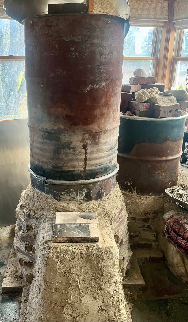 Freshly built J-tube style RMH combustion unit (center), with second barrel (right) as stratification chamber between the combustion unit and the cob thermal mass bench (mostly out of frame, far right).